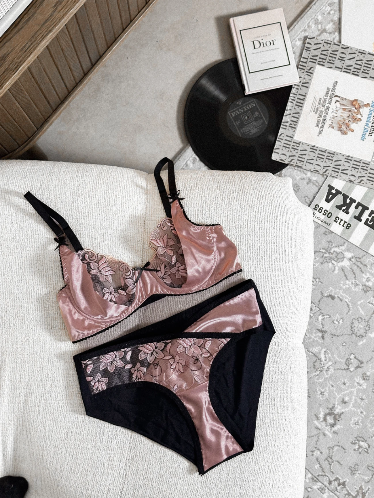 Tento set z hebkého starorůžového saténu a starorůžové vyšívané krajky s květinovým motivem je ztělesněním ženskosti v každé podobě. Podprsenka s kosticemi tvaruje dekolt přirozeně, aniž by ztrácela na pohodlí. Kalhotky z vyšívané tylové krajky a saténu působí elegantně, přitom smyslně a sebevědomě. Každý detail je navržen tak, aby zvýraznil krásu tvého těla – ne ji schoval. 💫 Pro ženy, které milují kontrasty – něhu i sílu, jemnost i vášeň. Materiál: vyšívaný tyl s jemnou výšivkou a jemný satén Vlastnosti: lehký, elegantní, nepružná a pružná varianta Detail: precizní výšivka dodává prádlu jemný a sofistikovaný vzhled