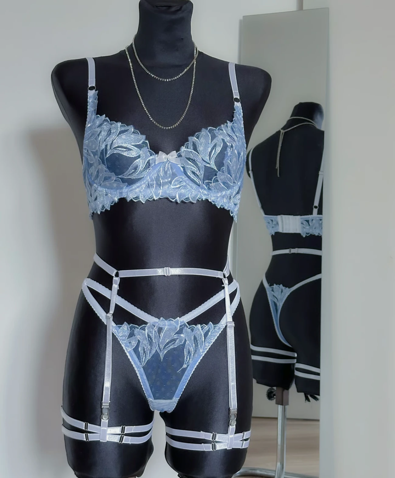 Záře jemnosti, klid moře, síla ženskosti. Set Luna Blue je ztělesněním klidné krásy a ženské elegance. Jeho světle modrý odstín připomíná ranní oblohu nad mořem, zatímco jemný, příjemný materiál se hladce přizpůsobí tělu a nechá vyniknout tvým křivkám. Bílá krajka a ladící podvazky dodávají outfitu něžný kontrast a vytvářejí harmonii, která působí čistě, svěže a neodolatelně. Luna Blue je ideální volba pro chvíle, kdy se chceš cítit výjimečně jemná – ale stále se silou v sobě.🌊🤍 Materiál: vyšívaný tyl s jemnou výšivkou Vlastnosti: lehký, elegantní, nepružná a pružná varianta Detail: precizní výšivka dodává prádlu jemný a sofistikovaný vzhled
