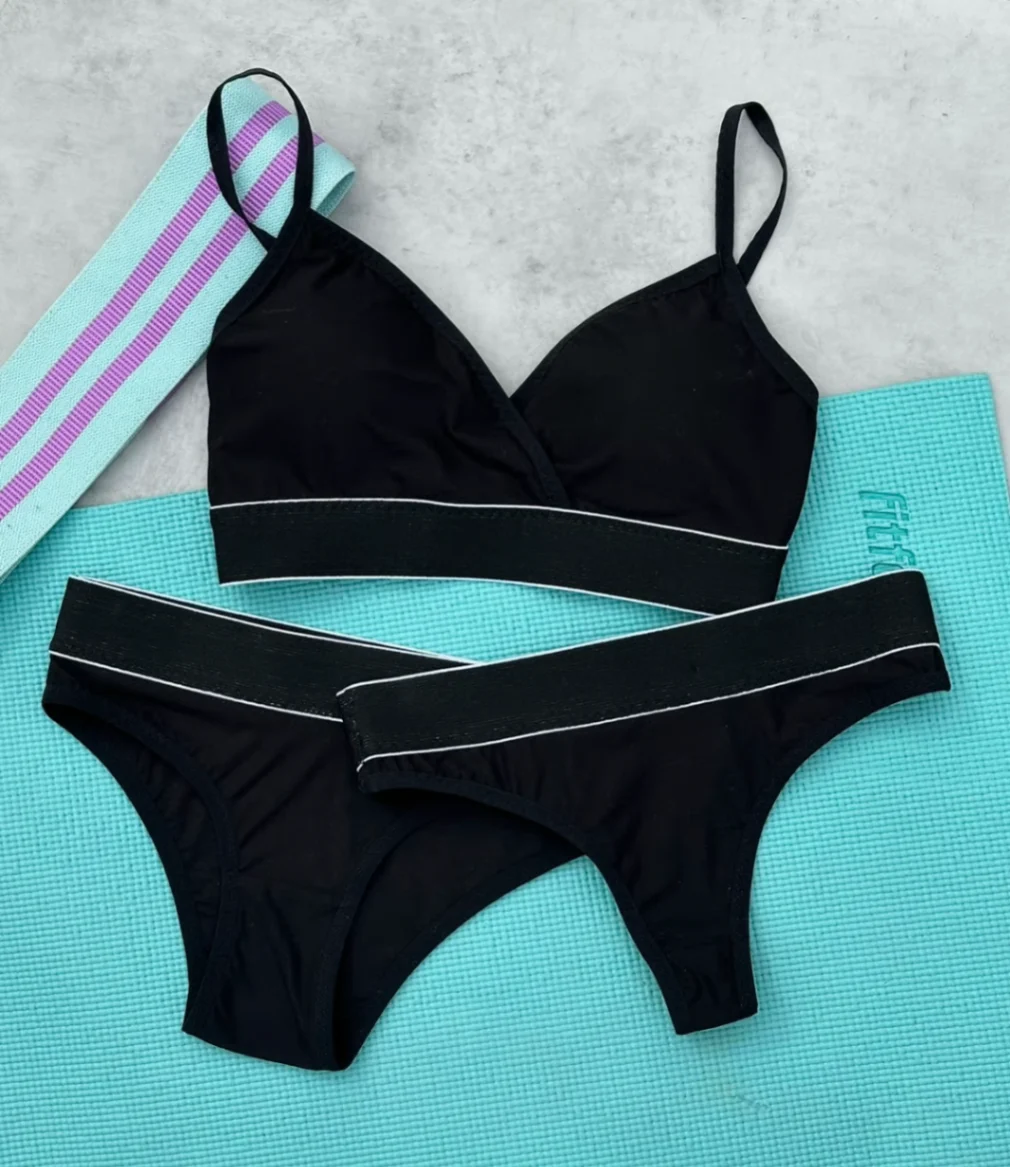 Ideální na sport, ale tak pohodlný, že ho nebudeš chtít sundat ani doma. Minimalistický design v klasické černé barvě dodá sebevědomí, ať už jsi v posilce, na józe nebo prostě jen v moodu “dnes jsem queen.” Podprsenka z jemného, příjemného materiálu pevně obejme hrudník a zůstane na svém místě i při největším tempu. Kalhotky doplňuje široká pruženka, která perfektně drží kolem pasu a nikam neklouže – takže se můžeš soustředit jen na pohyb. 🧘♀️🚴♀️ Materiál: bavlněný úplet Vlastnosti: měkký, prodyšný, příjemný na pokožce Komfort: ideální pro pohyb i domácí pohodu