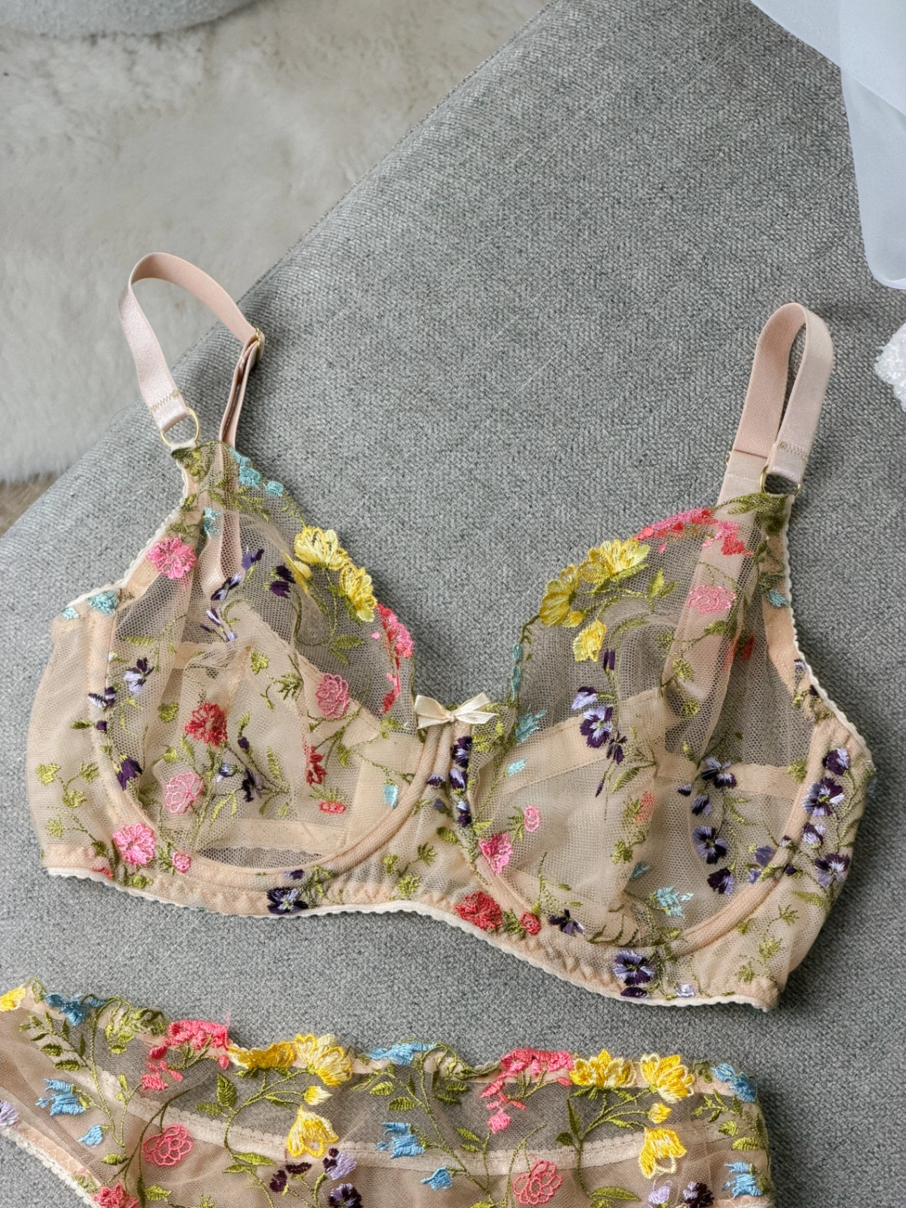 Jemnost inspirovaná přírodou. Meadow Bloom podprsenka zaujme vyšívaným tylem s drobnými květinovými motivy v pastelových tónech, které působí lehce, svěže a přirozeně. Transparentní vzhled dodává prádlu něžnou smyslnost, zatímco promyšlený střih s kosticí zajišťuje oporu a krásné tvarování. Podprsenka je ideální volbou pro ženy, které hledají rovnováhu mezi jemností a funkčností. Skvěle sedí, zvýrazňuje dekolt bez přehánění a nabízí pocit lehkosti při každodenním nošení. Meadow Bloom je jako letní louka na kůži – klidná, ženská a přirozeně krásná. 🌸