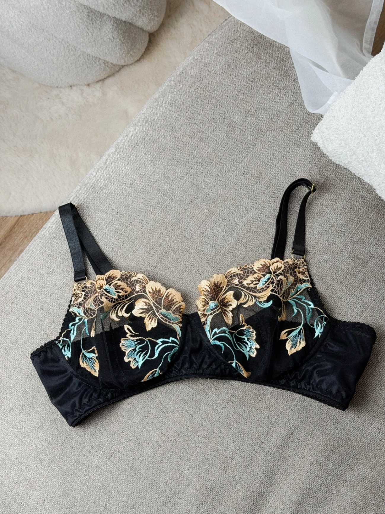 Tichá elegance zimy. Podprsenka January Noir je lednovou limitovanou edicí inspirovanou kontrastem temných tónů a jemných detailů. Černý vyšívaný tyl doplňuje bohatá květinová výšivka v tlumených zlatých a tyrkysových odstínech, která působí sofistikovaně, klidně a nadčasově. Promyšlený střih poskytuje oporu a krásné tvarování, zatímco transparentní materiál zachovává lehkost a ženskost. Každý detail je navržen s důrazem na eleganci, která není prvoplánová, ale zůstává v paměti. January Noir je limitovaná edice vytvořená pro ženy, které milují výjimečné kousky a jemnou, sebevědomou smyslnost. 🖤❄️