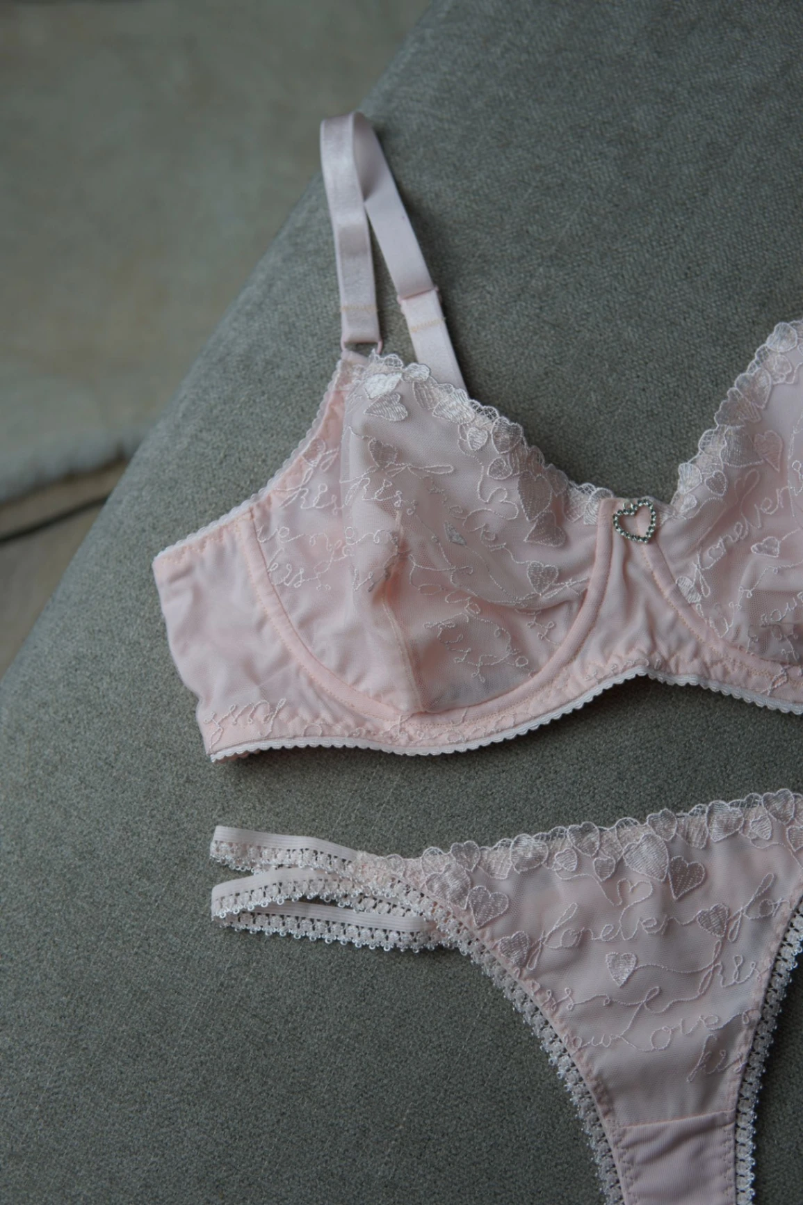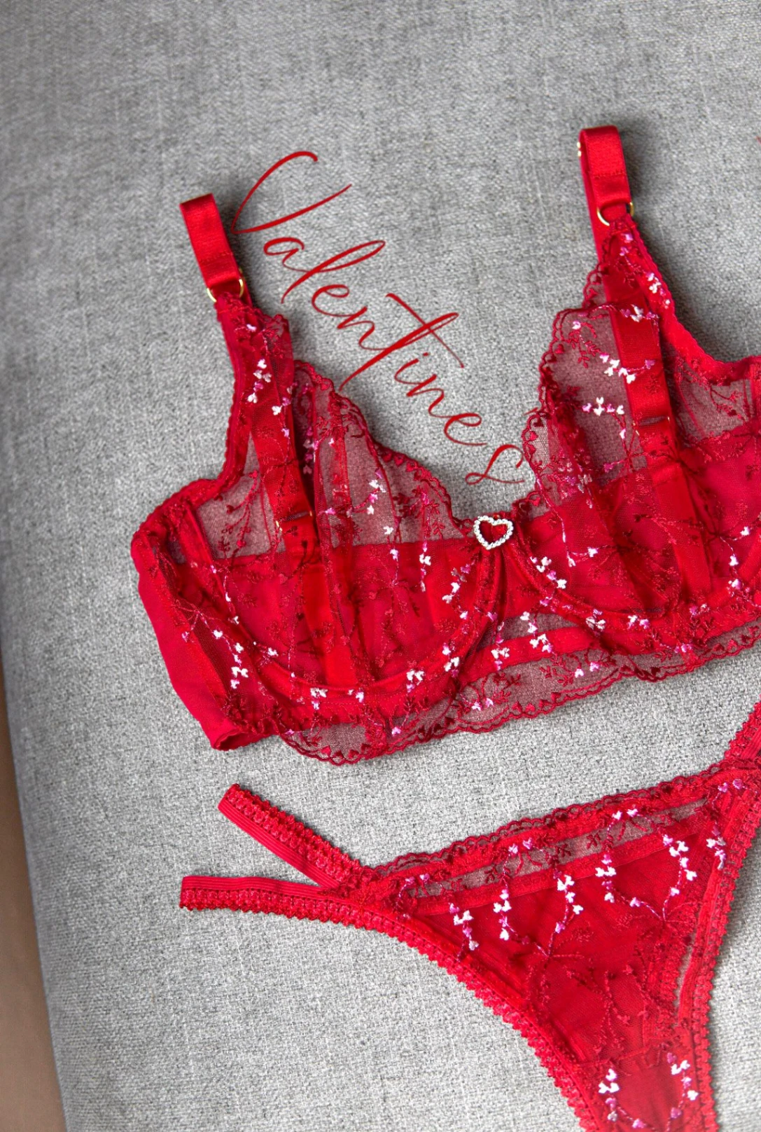 Jemná láska s odvahou. No.01 – Blush Valentine je set z vyšívaného tylu se srdíčkovými detaily v světle růžovém odstínu, který působí něžně, romanticky a hravě. Transparentní provedení bez podšívky dodává setu lehkost a smyslnost, která nepůsobí přehnaně, ale přirozeně. Podprsenka je lehká a vzdušná, ideální pro chvíle, kdy chceš cítit svobodu a jemný dotek materiálu na kůži. Kalhotky jsou navržené tak, aby byly odvážnější na pohled, ale pohodlné na nošení. Blush Valentine bez podšívky je o pocitu lehkosti, flirtu a ženské hravosti. 💗